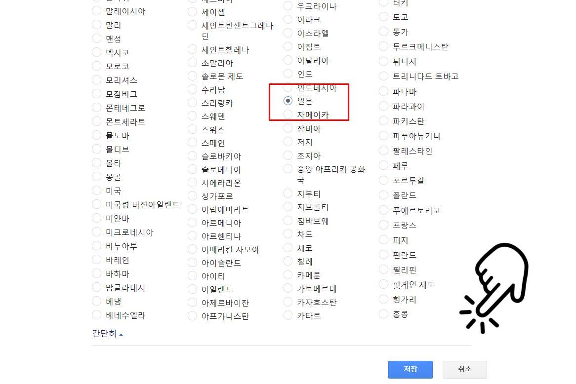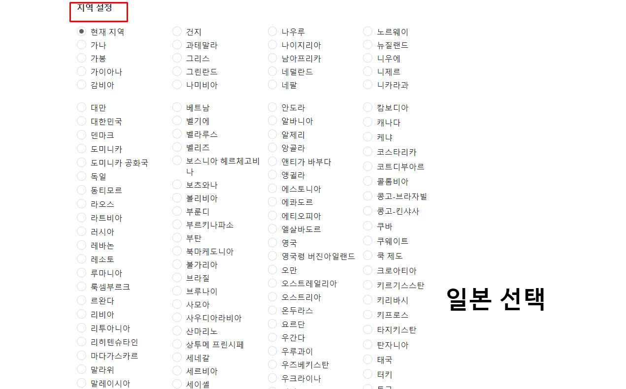 화면을 아래로 스크롤 해 내린 후 '지역 설정' 에 일본을 찾아서 클릭합니다.